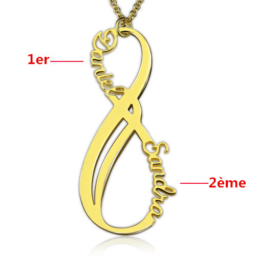 Le symbole d'infini peut signifier l'amour infini et l'amitié éternelle et maintenant vous pouvez personnaliser l'infini avec le Collier de Nom d'Infini Vertical. Personnalisez ce collier avec deux noms pour montrer votre amour ou amitié à un de vos proches.