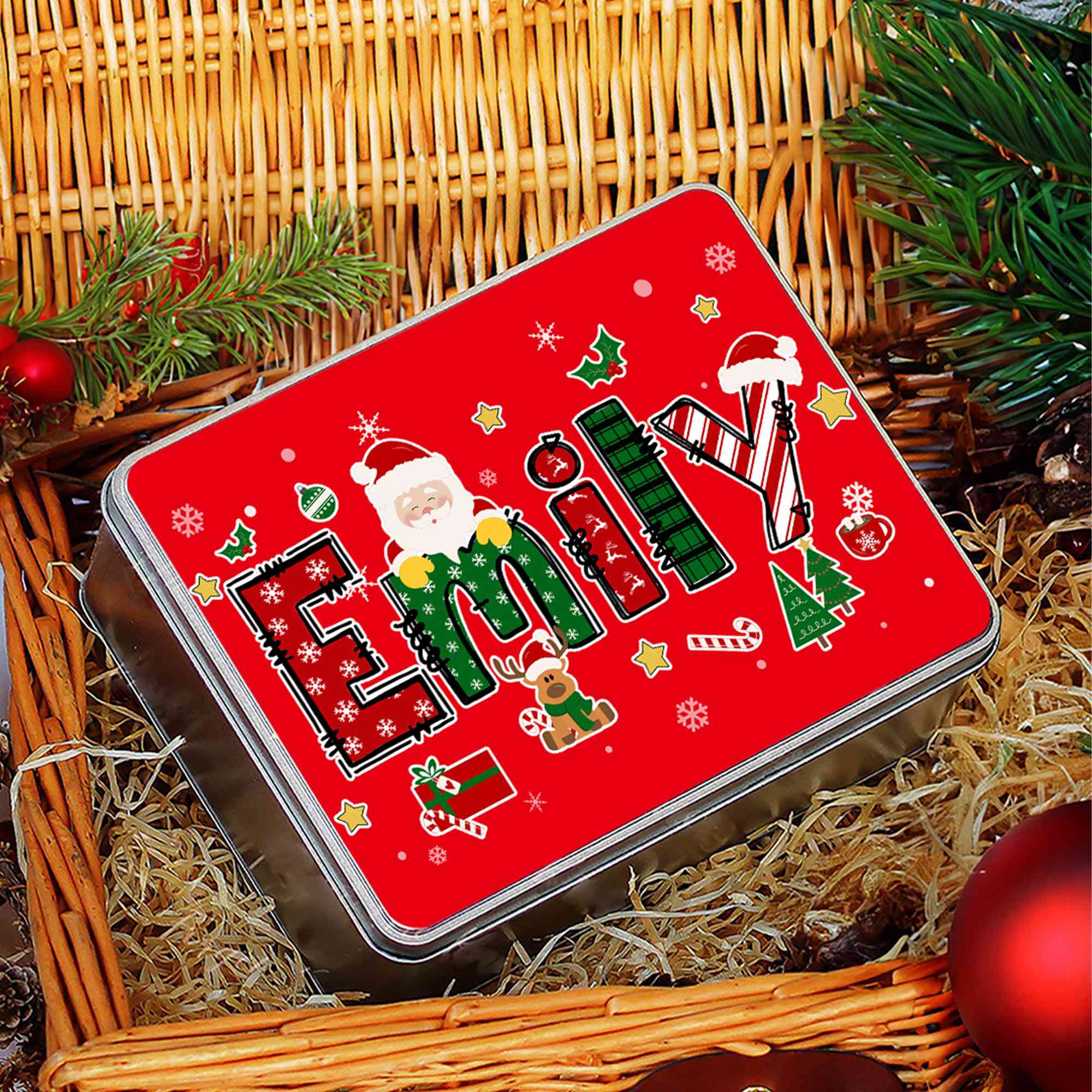 Nom personnalisé - Le couvercle peut être personnalisé avec n'importe quel nom, ajoutant ainsi une touche personnelle et attentionnée. C'est une merveilleuse façon d'étiqueter vos friandises ou de donner une touche unique à vos cadeaux de Noël, rendant chaque boîte véritablement unique.
