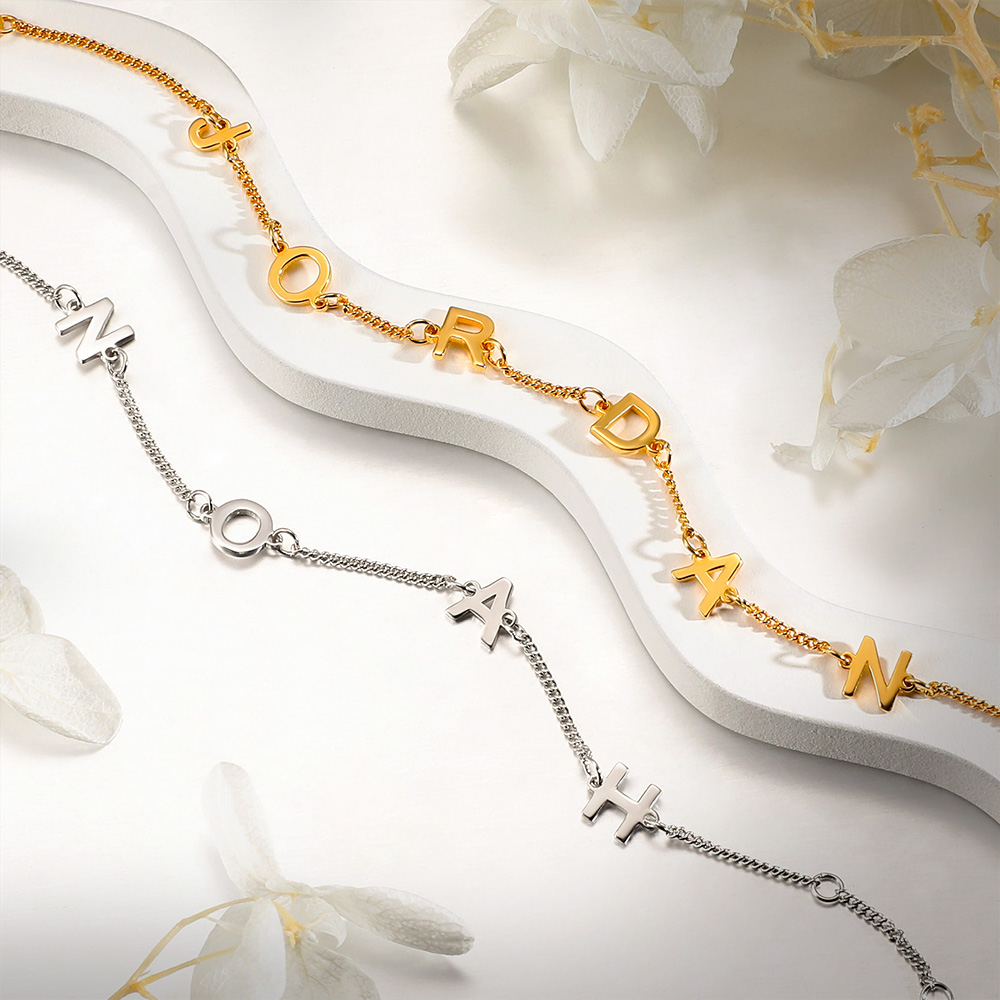 Ce bracelet de prénom est un bijou élégant et magnifique. C'est un produit indispensable pour les amateurs de bijoux. Choisissez simplement la lettre que vous voulez et nous personnaliserons soigneusement ce bracelet délicat et élégant pour vous. Ce bracelet peut être personnalisé jusqu'à 8 lettres, nous utilisons l'argent 925 comme matériau pour la production et vous proposons trois couleurs au choix ! Veuillez commencer votre personnalisation immédiatement, nous l'emballerons dans une belle boîte et vous l'enverrons!