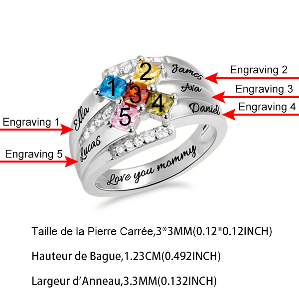 Notre série de bagues avec pierres de naissance sont de haute qualité, sur les quelles nous gravons des prénoms correspondant à chaque pierre, mais aussi une petite phrase au maximum 20 caractères pour l'intérieur d'anneau. En plus, vous pouvez choisir la couleur de chaque pierre. Cadeau vraiment idéal pour mères, grands-mères, soeurs ou amies. Alors dépêchez-vous. Que ces bijou sont magnifiques, brillantes et spéciales !