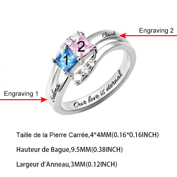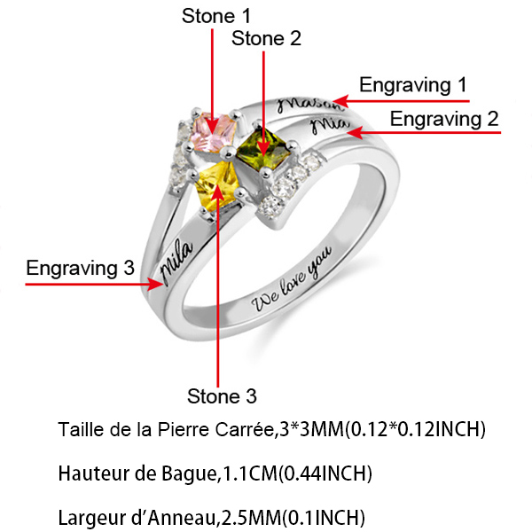 Notre série de bagues avec pierres de naissance sont de haute qualité, sur les quelles nous gravons des prénoms correspondant à chaque pierre, mais aussi une petite phrase au maximum 20 caractères pour l'intérieur d'anneau. En plus, vous pouvez choisir la couleur de chaque pierre. Cadeau vraiment idéal pour mères, grands-mères, soeurs ou amies. Alors dépêchez-vous. Que ces bijou sont magnifiques, brillantes et spéciales !