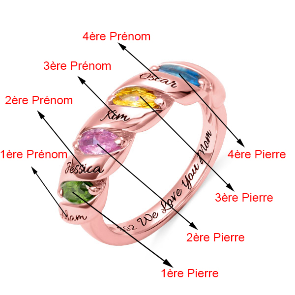 Notre série de bagues avec pierres de naissance sont de haute qualité, sur les quelles nous gravons des prénoms correspondant à chaque pierre, mais aussi une petite phrase au maximum 20 caractères pour l'intérieur d'anneau. En plus, vous pouvez choisir la couleur de chaque pierre. Cadeau vraiment idéal pour mères, grands-mères, soeurs ou amies. Alors dépêchez-vous. Que ces bijou sont magnifiques, brillantes et spéciales !