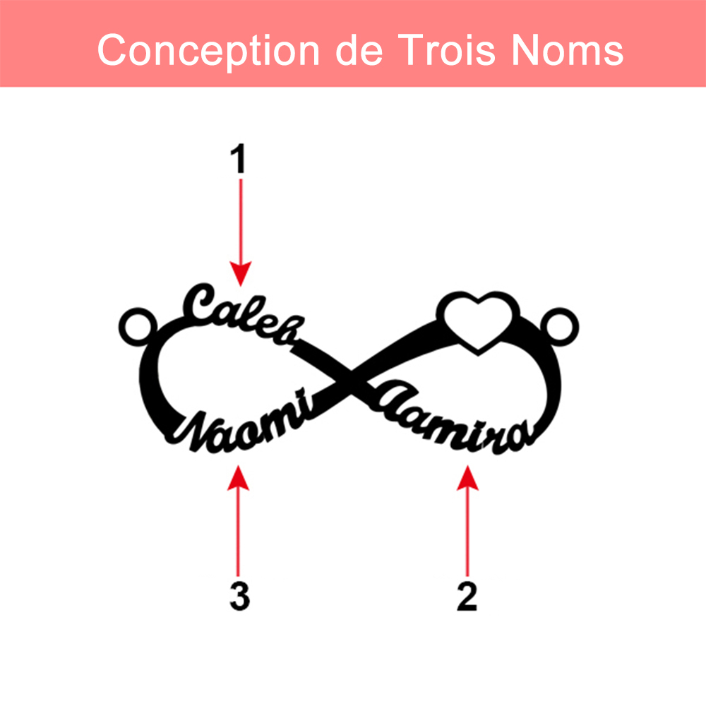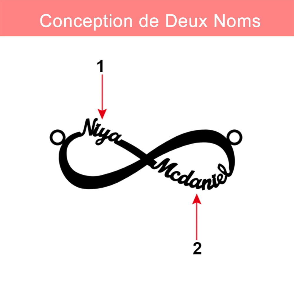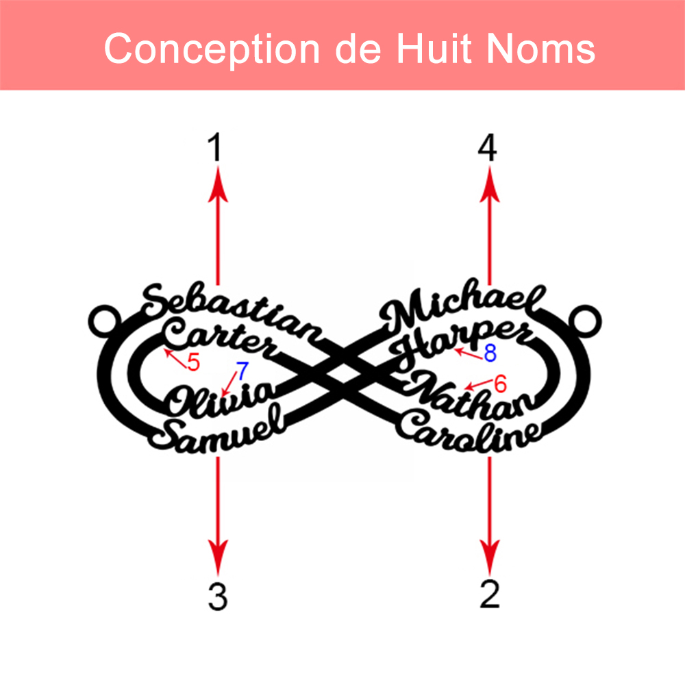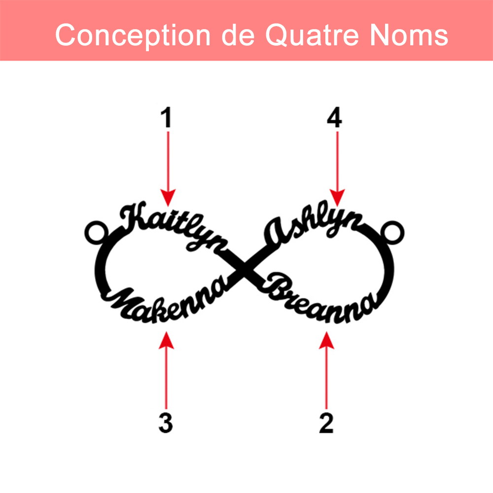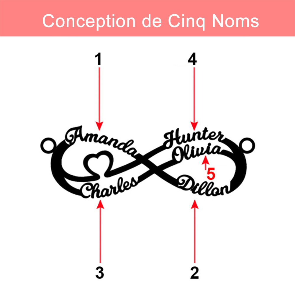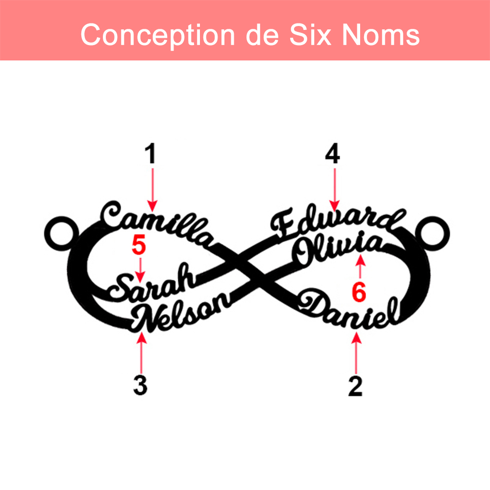 Ce collier avec symbole d'Infini qui signifie l'affection interminable entre les membres de famille, entre les amis pou entre deux amoureux. Nous pouvons graver au maximum 8 prénoms pour ce pendentif, et un prénom devrait moins de 7 caractères. Ce bijou sera le cadeau parfait pour la fête des mères ou le Noël, ou bien l'anniversaire de votre mère.